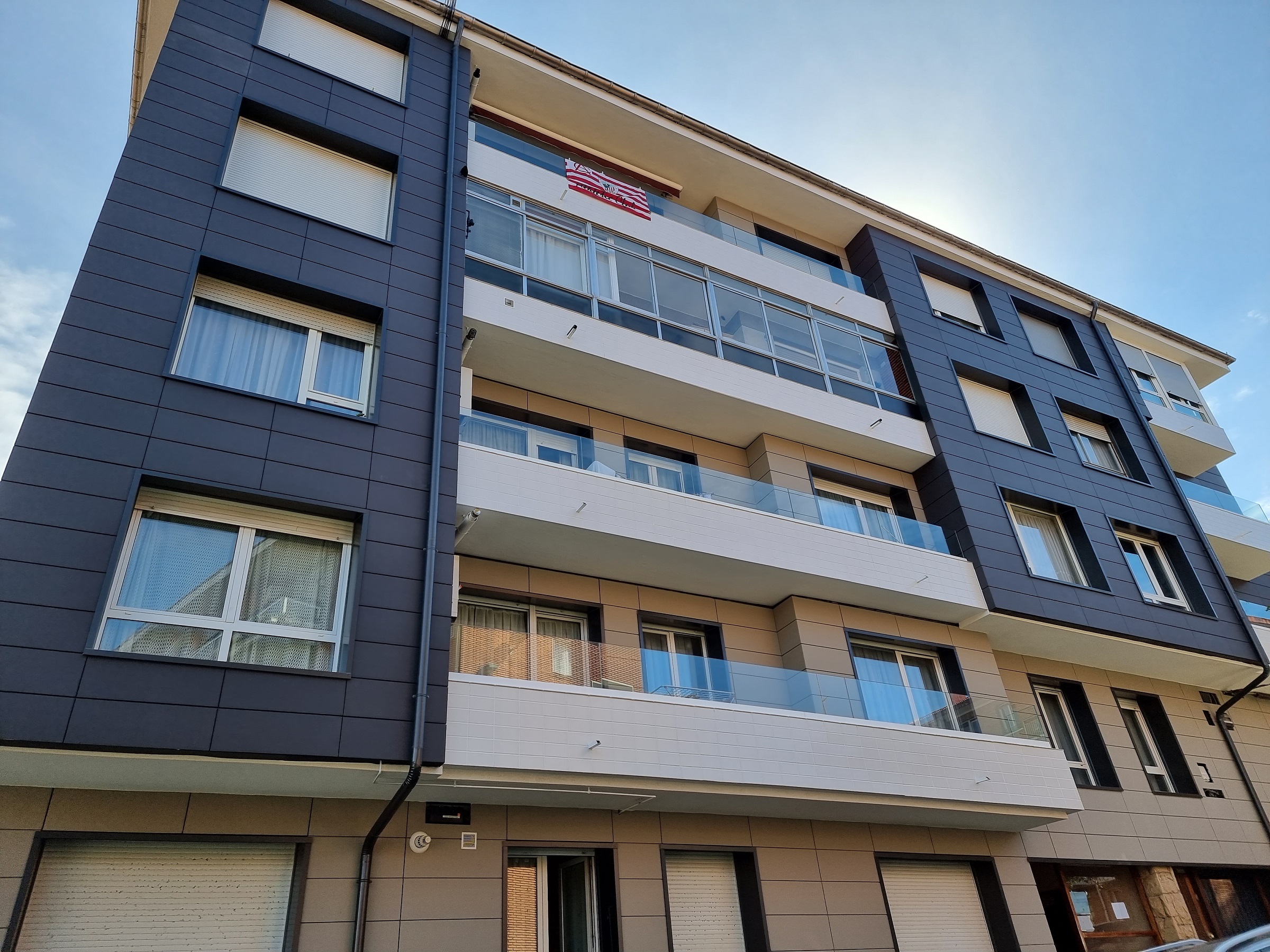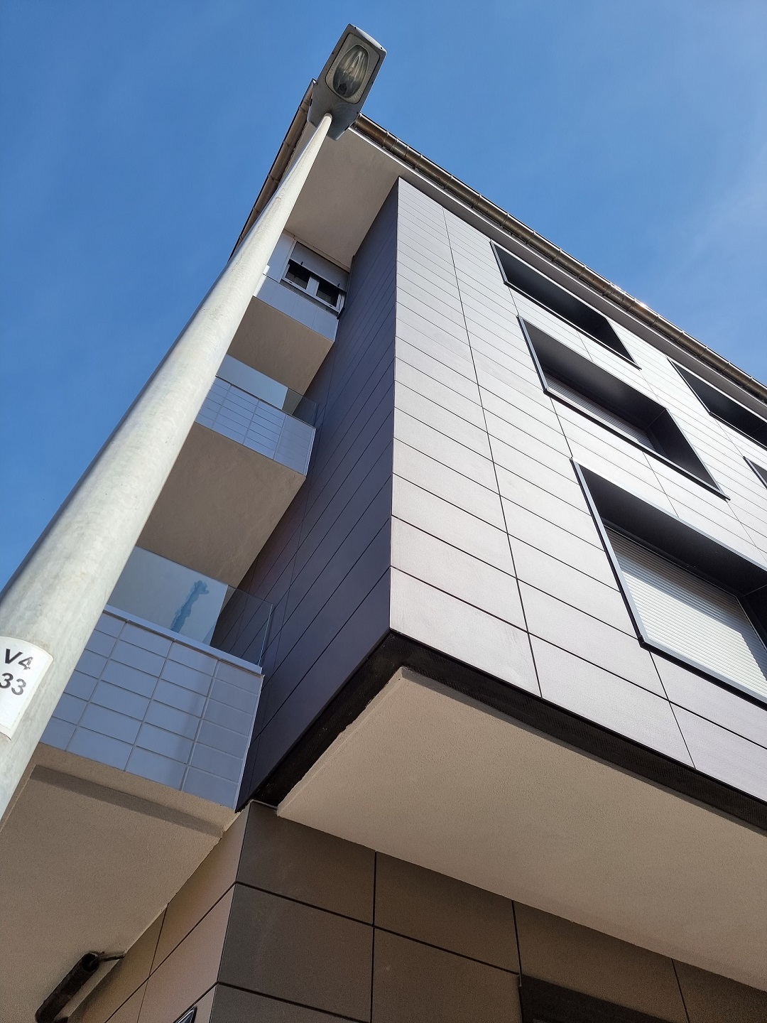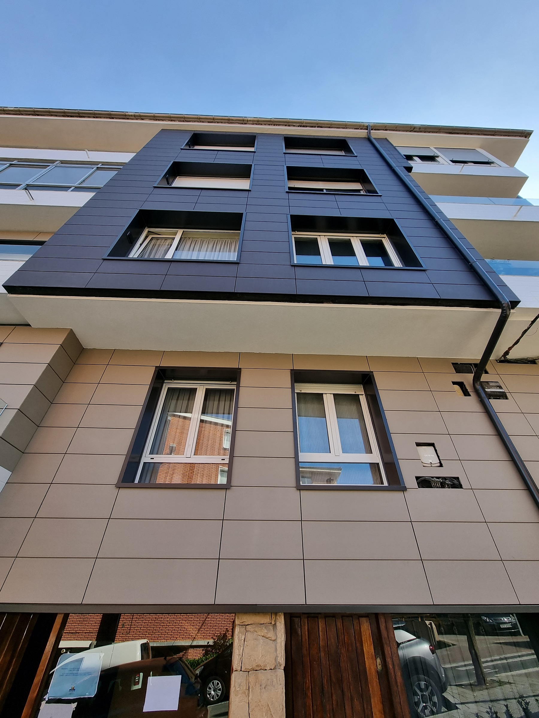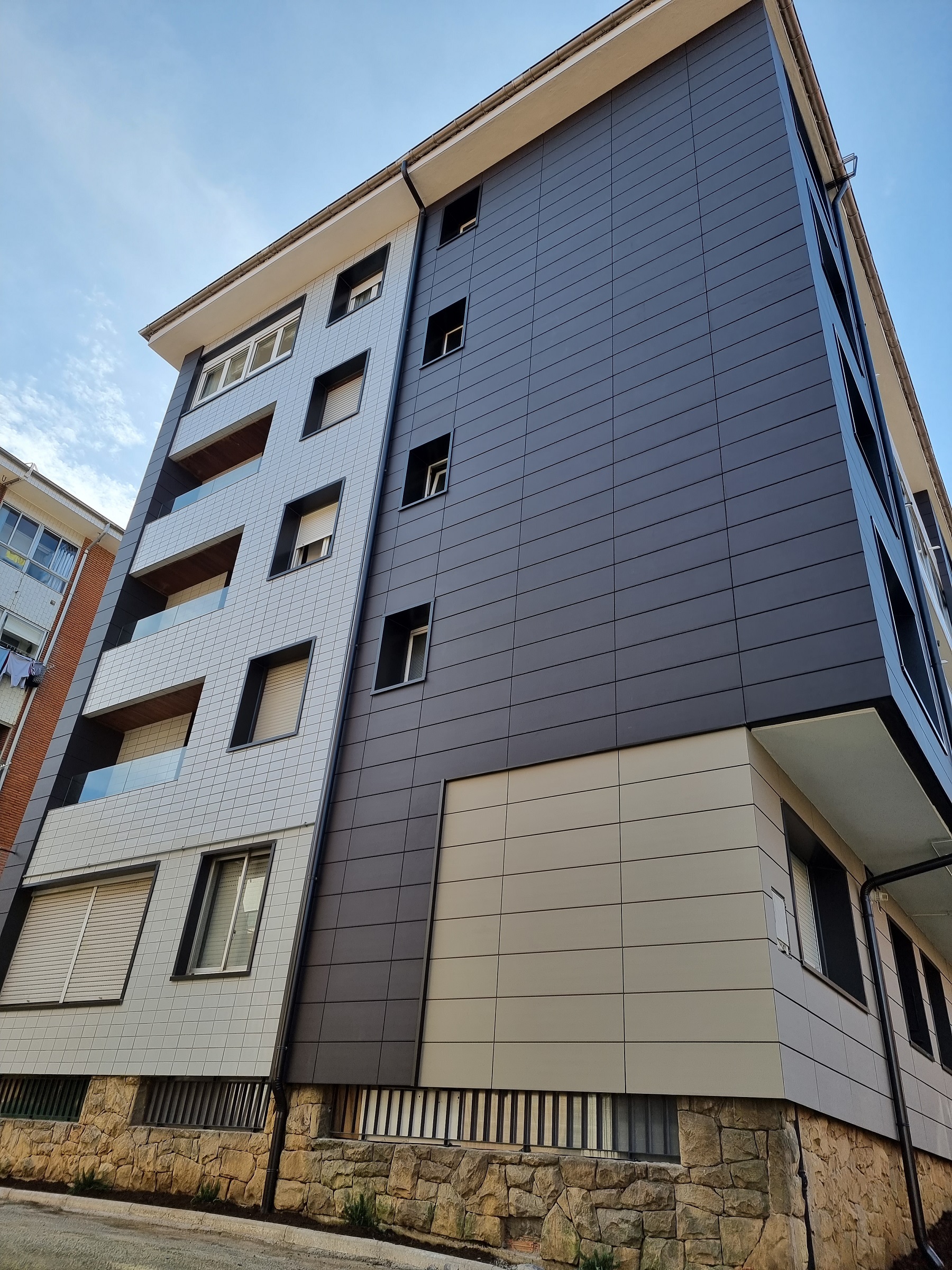 Edificio de los años 50 rehabilitado con fachada ventilada de cerámica fotocatalítica Buchtal. Se utilizaron 500 m2 de cerámica Keratwin K20, fabricado de forma expresa (como siempre en nuestros proyectos) en los colores naturales gris 414 y negro 409.